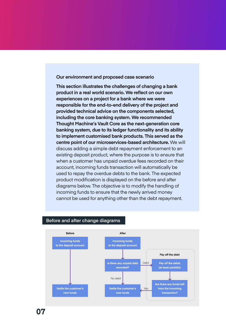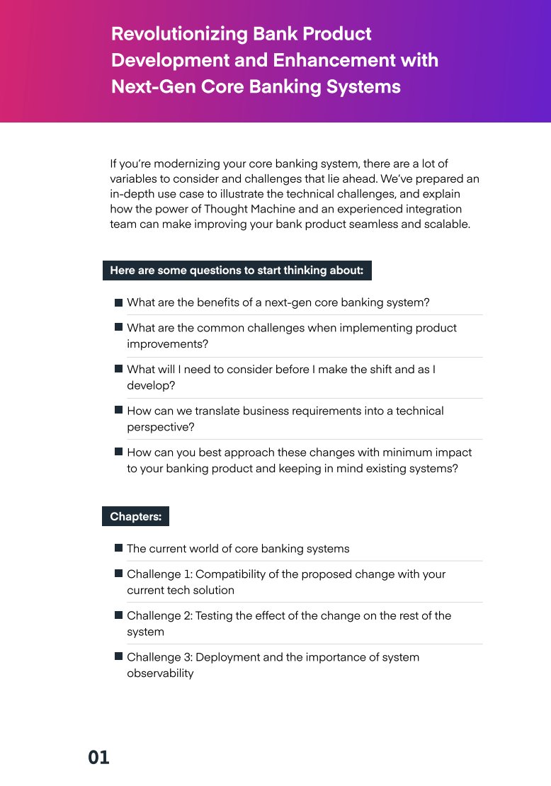 We’ve prepared an in-depth use case to illustrate the technical challenges, and explain how the power of Thought Machine and an experienced integration team can make improving your bank product seamless and scalable.